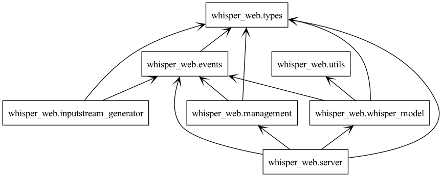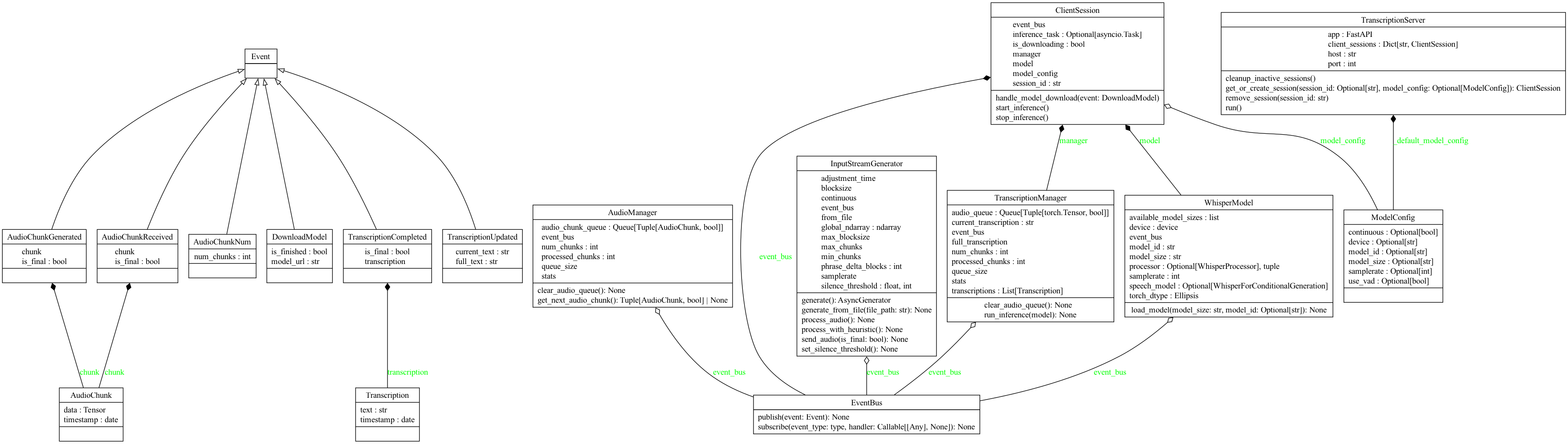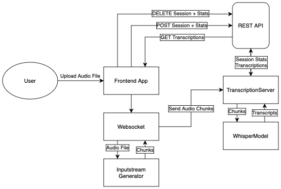 The Whisper Web system follows an event-driven, microservice-oriented architecture that enables real-time audio processing and transcription. The system is designed with loose coupling between components, allowing for scalability and maintainability.